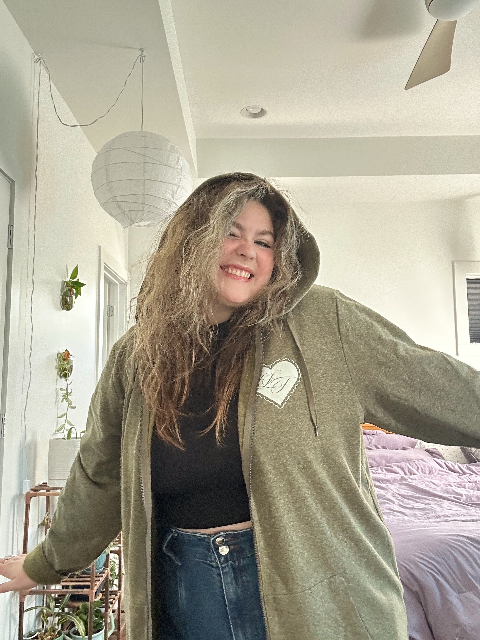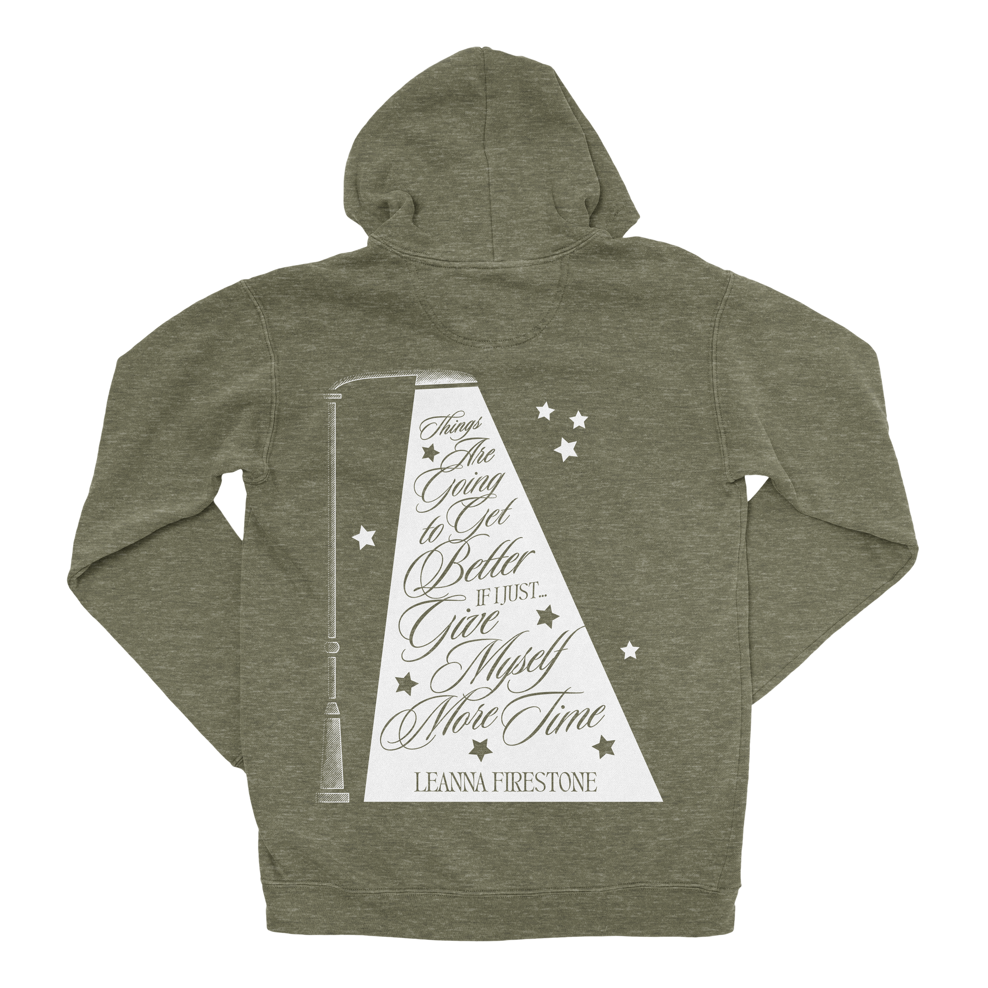 This forest green zip-up hoodie, inspired by Leanna Firestone’s “Least Favorite Only Child,” is a soft reminder that healing takes time. A heart with Leanna’s initials accents the front, while the back showcases a vintage street lamp with the lyric “Things are going to get better if I just give myself more time,” her name, and stars.