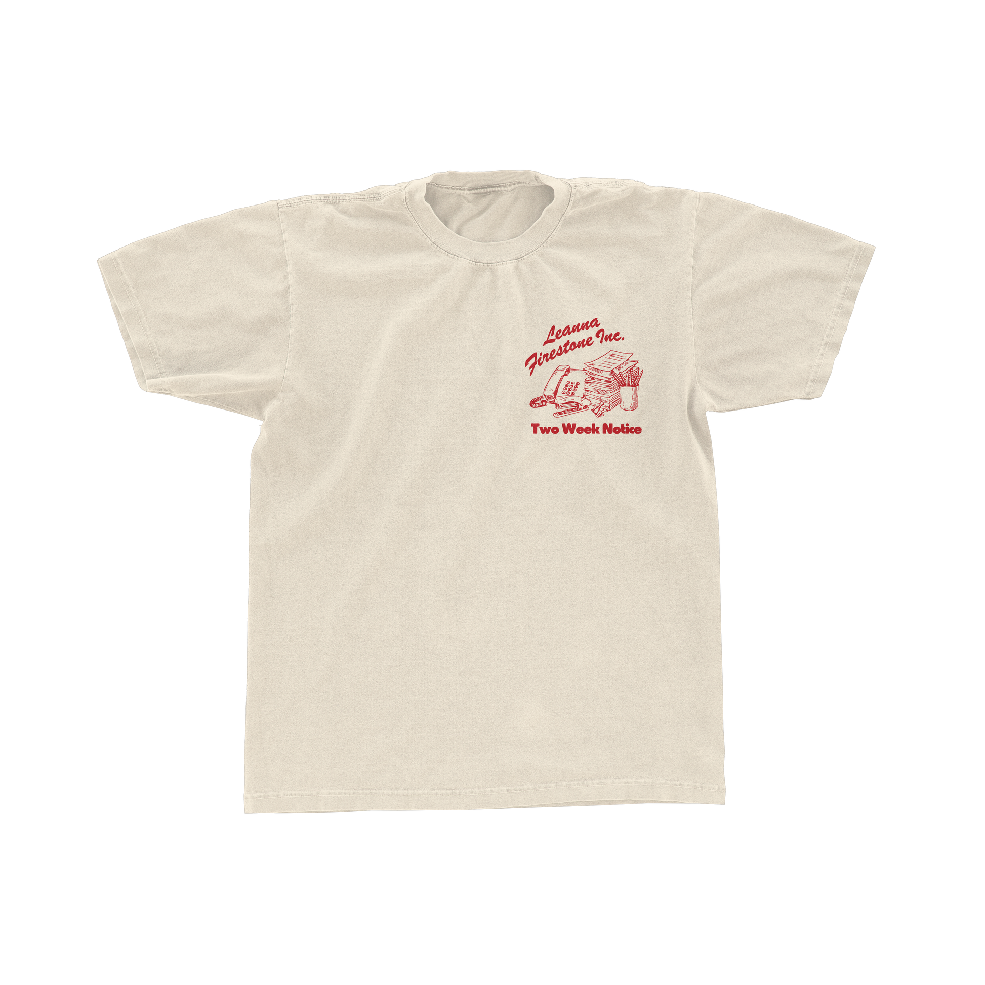 Inspired by Leanna Firestone’s “Two Week Notice,” this vintage-style tee is for the overworked and underpaid girlies. The front shows a red “Leanna Firestone Inc.” logo with office supplies and “Two Week Notice.”