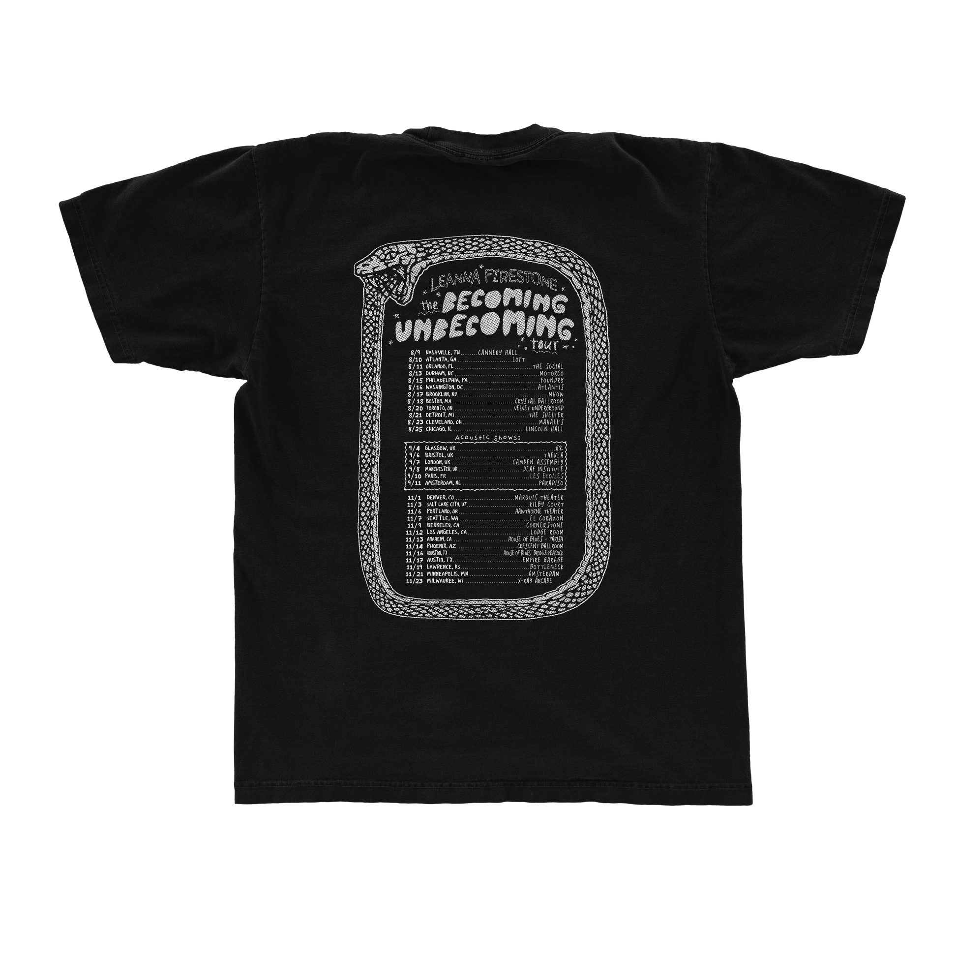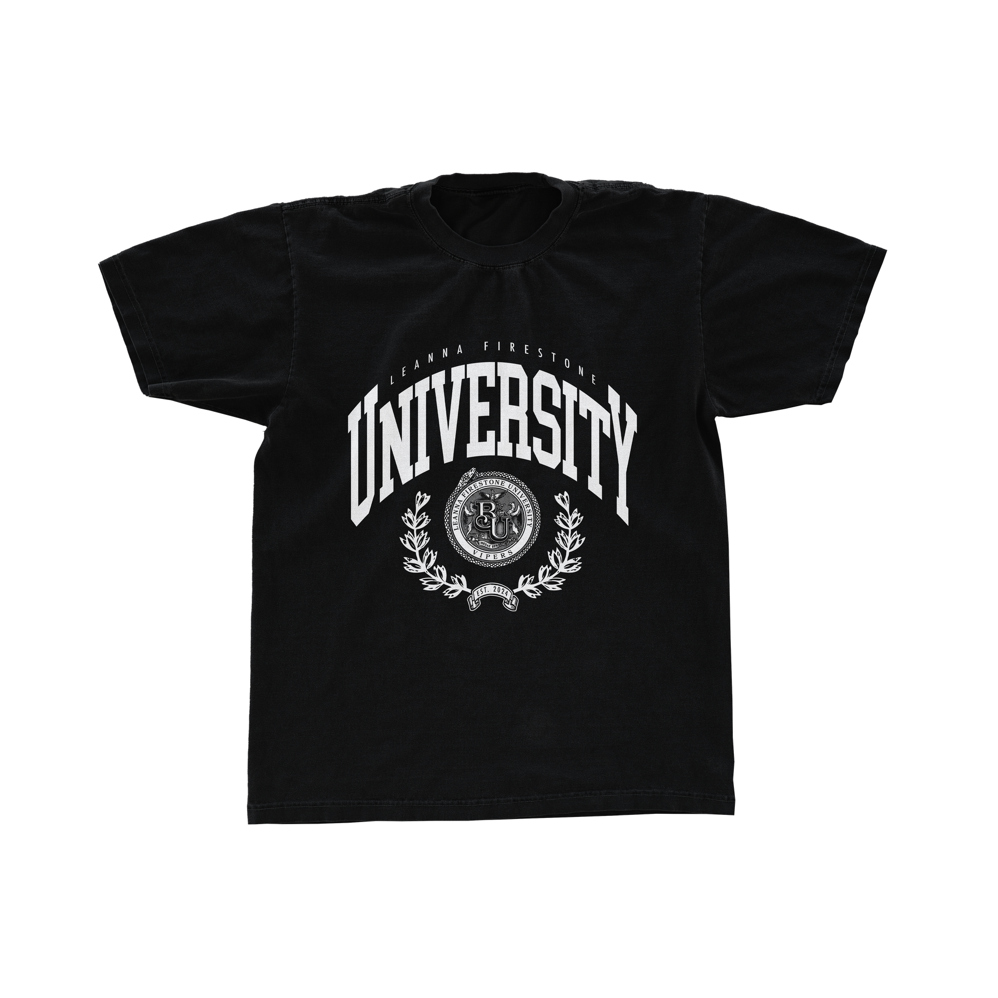 Features the official Leanna Firestone University seal in white across the chest. Back includes the Becoming Unbecoming Tour dates.